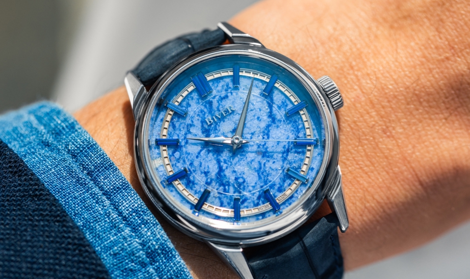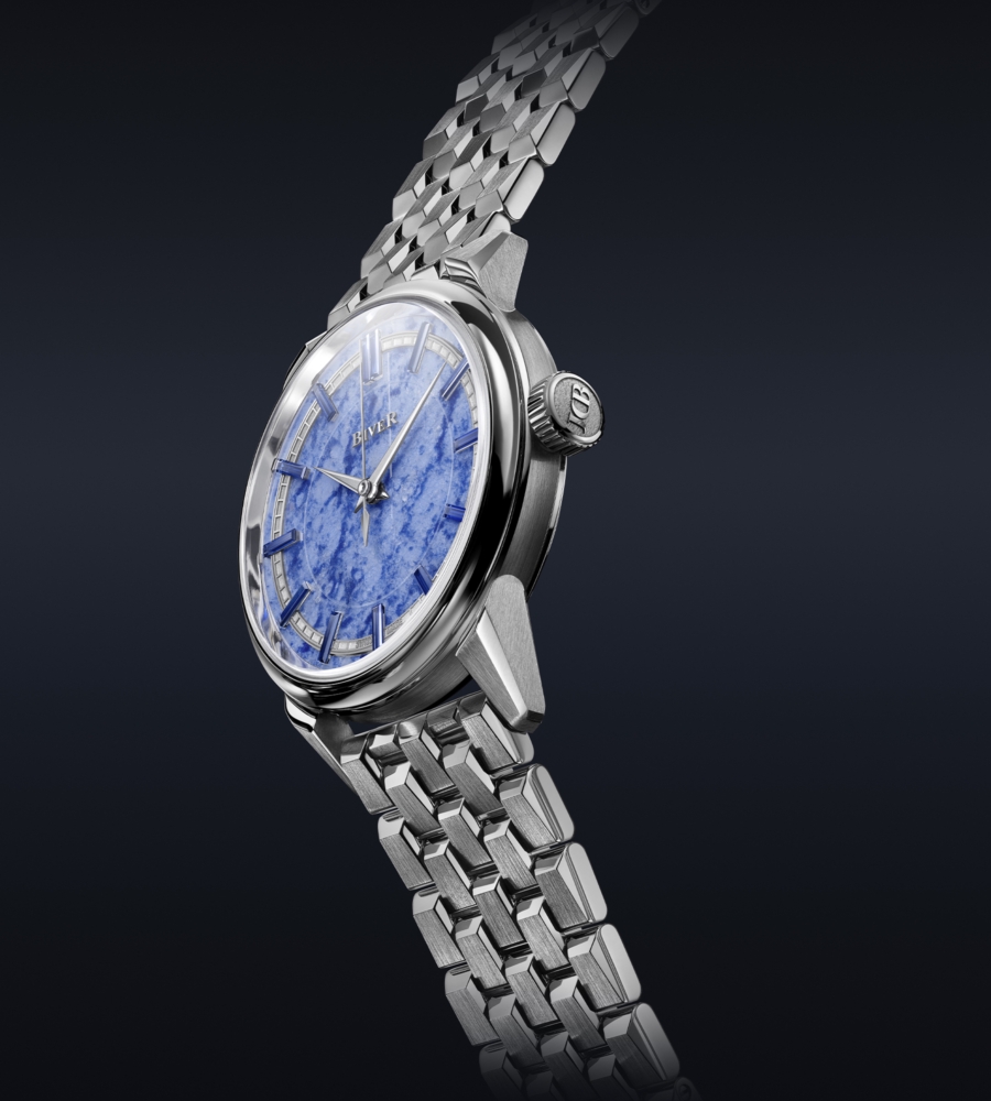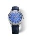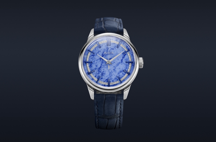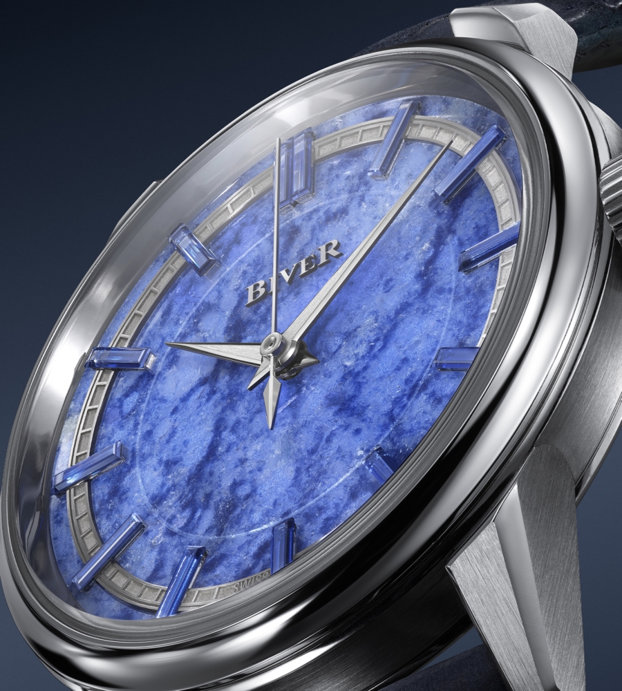 The lustrous surface of Blue Quartzite is something only mother nature could create. At once, it resembles both an icy lake in midwinter and lacy clouds against a bright summer sky, the light blue and white ground punctuated by darker blue veins. The addition of 13 baguette-cut blue sapphires for the hour markers add even more depth to the dial echoing the stone’s colors and playfully reflecting its textures and tones.