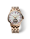 A trio of natural materials come together in the Carillon Tourbillon Desert Rose, each amplifying the others’ effects. The lustrous mother-of-pearl dial offers a bright, iridescent canvas on which the streamlined ruby hour markers appear to glow, all held together with the warmth of the rose gold case.