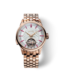 A trio of natural materials come together in the Carillon Tourbillon Desert Rose, each amplifying the others’ effects. The lustrous mother-of-pearl dial offers a bright, iridescent canvas on which the streamlined ruby hour markers appear to glow, all held together with the warmth of the rose gold case.