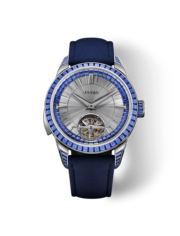 This Carillon Tourbillon combines a richly textured green and red bloodstone dial with a pair of hand-engraved white gold skeletons, all housed in a titanium case that amplifies the minute repeater’s beautiful chimes.